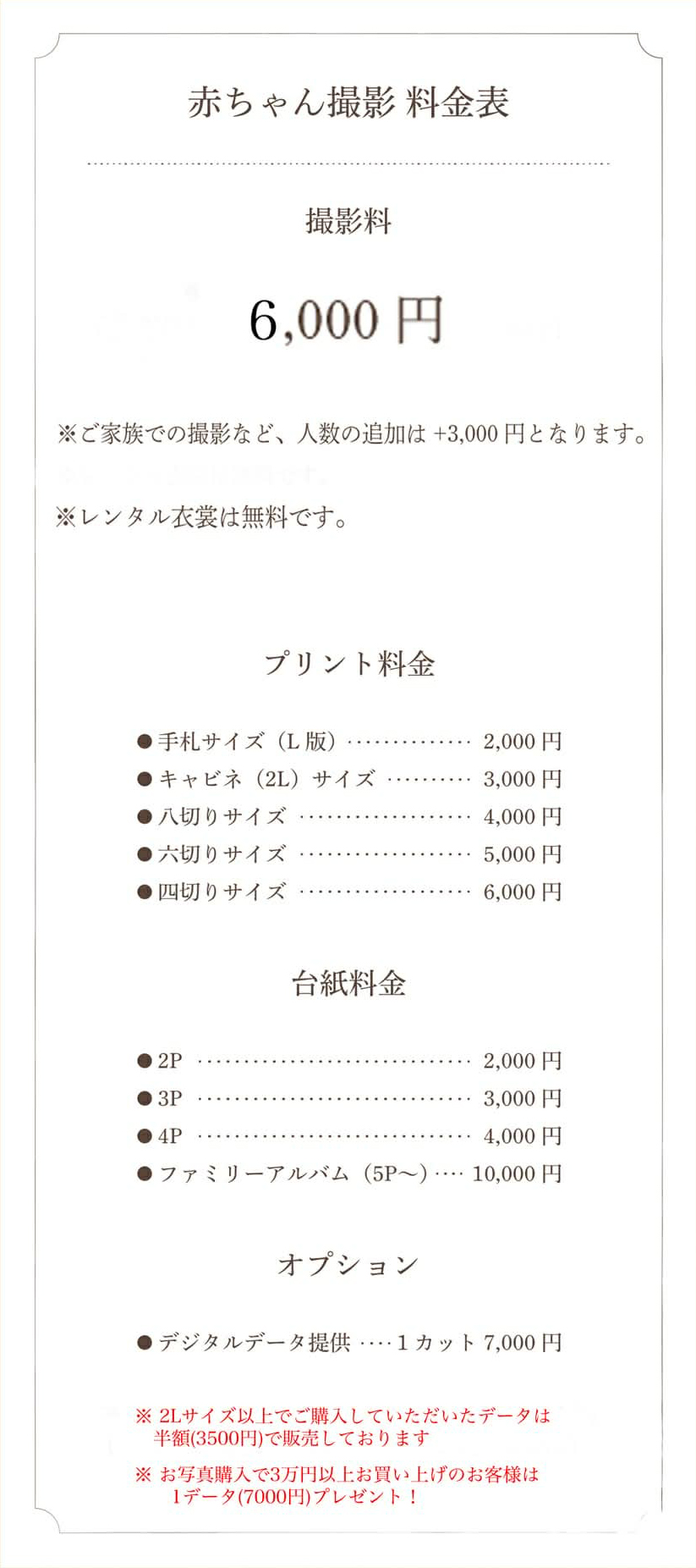 毎年の誕生日ごと、お子様の成長を写真で綴ってみられませんか?お子様が大人になってご覧になれば、ご家族の愛情を感じられる一生の宝物になるでしょう。お一人写しはもちろん、ご家族での写真もぜひ残してみられませんか。