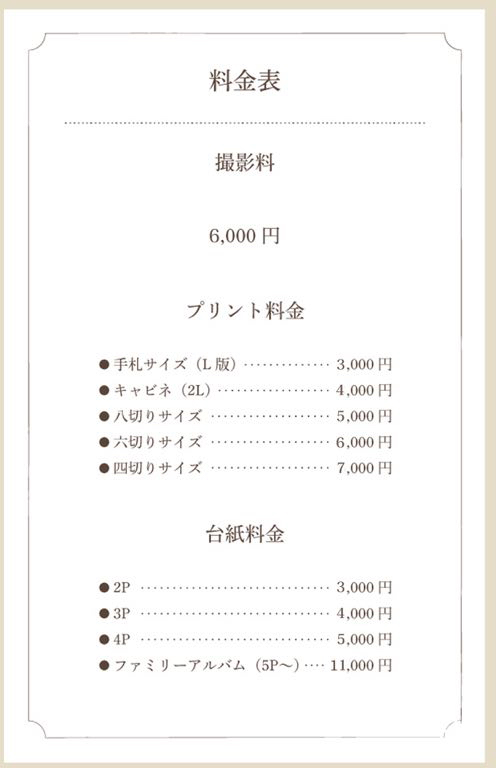 デジタルカメラが普及し、気軽に写真が撮れる時代になりました。ですが、家族全員の笑顔が揃う写真を残す機会は少ないのではないでしょうか。私たちは、写真館で記念撮影をするその時間までも、大切な宝物にしていただきたいのです。見ると幸せな気持ちがよみがえる、そんな家族写真を残しませんか。